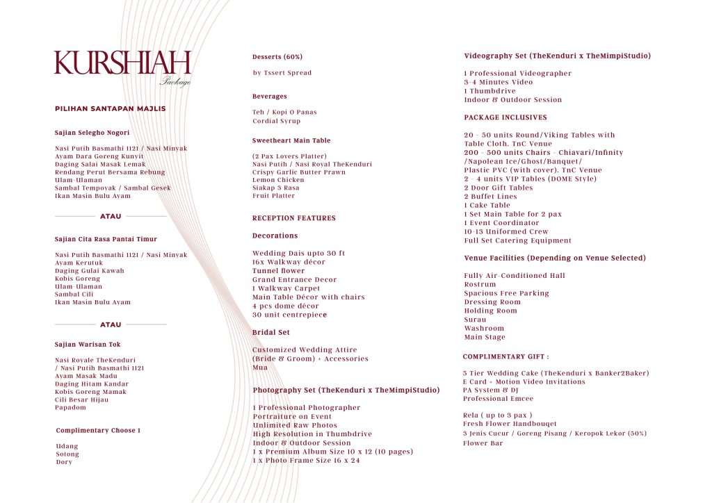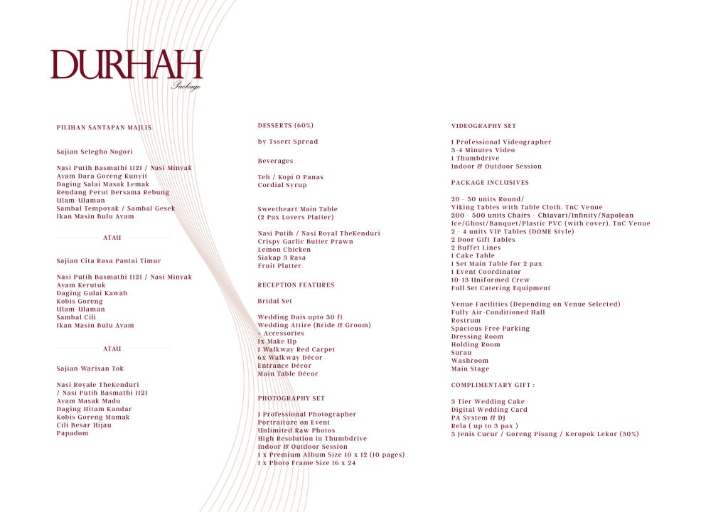 Selain itu, kami menyediakan pakej kahwin eksklusif yang merangkumi dewan berhawa dingin, katering sedap, pelamin cantik, busana pengantin, fotografi profesional dan pengurusan majlis dari A hingga Z.